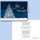 A frente deste cartão de Natal bonito tem uma árvore branca cintilante composta por imagens em flocos de neve contra um céu noturno azul estrelado profundo. O texto em branco ao lado diz "Alegria ao Mundo". O dentro deste cartão tem a letra da música "Joy to the World", que foi escrita há 300 anos. O dentro inferior tem dois campos de texto para personalizar.