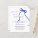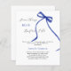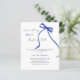 Um fundo branco elegante, decorado com arco azul escuro. Personalize e adicione um nome e detalhes da parte. Texto: Algo azul antes de mim. 1 folha = 1 convite impresso de borda a borda.