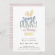 Um convite de aniversário bonito e colorido de "coelhinho". Tipografia de Pastel com sotaque de ouvido coelho e padrão de suporte do estilo de basketweave desenhado à mão.