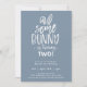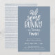 Um convite de aniversário bonito de "coelhinho" em azul empoeirado. Tipografia branca com sotaque de ouvido coelho e padrão de suporte do estilo de basketweave desenhado à mão.