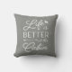 O travesseiro decorativo moderno russo apresenta uma cinza média com "a vida é melhor na cabana", encoberta por tipografia branca. Personalize o reverso com seu nome de família e ano estabelecido.
