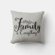 Travesseiro com citação no escrevendo cursivo preto "Família é Tudo" em fundo cinza do que texturizado. Design por Farmhouse Living. As opções de tamanho e tecido estão disponíveis e produtos adicionais de decoração doméstica com este design.