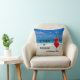 A vida começa na aposentadoria — Beba gelada no travesseiro decorativo da praia. Bebida vermelha gelada numa praia arenosa, céu azul lindo e ondas brancas esparsas.