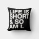 Travesseiro decorativo engraçado para as pessoas que são desafiadas verticalmente. A vida é curta e assim que o am I. Reversível, parte dianteira tem o texto branco no fundo preto, parte traseira tem o texto preto no fundo branco. © Lisa Marie Robinson de Copyright todos os direitos reservados. É ilegal para usar ou duplicar isto, ou alguma de nossas imagens, sem autorização escrita.