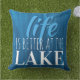 Espalhamento de grãos de madeira azul com citação do tema da praia que diz, "A vida é melhor no lago." Este travesseiro decorativo é perfeito para sua casa no lago ou qualquer quarto com decor náutico.