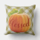 Travesseiro exterior bonito com um design de abóbora cor de laranja no outono num fundo branco e antigo de xadrez de gingham verde, e uma citação de texto "abençoada" agradecida. Sotaque de decoração de feriado de Ação de Graças por decorar a varanda da frente ou traseira, pátio ou veranda da sua casa de fazenda decorada, cabana de madeira, casa de lago rústico ou retiro aconchegante do rio.