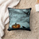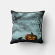 Design de Halloween vibrante que apresenta uma abóbora brilhante com olhos brilhantes e dentes numa paisagem escura com árvores e ravens.