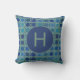 Abstract blue circle pattern with different shades of blue on monogrammed cushion.