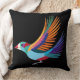 Um pássaro vibrante e colorido é representado em voo de médio, apresentando uma série impressionante de tons laranja, azuis e verdes brilhantes em suas asas e corpo. Sua design geométrica acrescenta um toque moderno e abstrato. Fundo preto