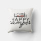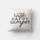 Uma legal ilustração desenhada por mão para aventureiros com uma câmera na floresta. O texto diz: Happy Camper.