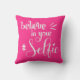 Palavras humorísticas e inspiradoras a serem exibidas em sua casa com esta citação Acredite em sua selfie em tipografia branca de na moda e um motif de hashtag em um fundo rosa-quente. O mesmo design está do outro lado.