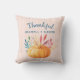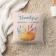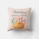 Um travesseiro quadrado com texto de tipografia que diz: Graças a grato abençoado. Perfeito para a época de Ação de Graças. Imagem de uma abóbora de cor d'água laranja com folhas e prigos de outono. Padrão listrado cor-de-rosa e dourado para o fundo.