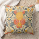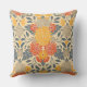 Este travesseiro decorativo quadrado tem flores e folhas em tons de cinza amarela, laranja e azul sobre fundo creme.