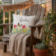 Destaque a decoração do seu espaço ao ar livre com este bonito travesseiro decorativo floral. Este travesseiro ao ar livre protegido por condições meteorológicas apresenta uma ilustração de papoilas vermelhas, flores pretas de Susan de olhos negros e flores azuis do botão do solteiro. Há também verde e borboleta. As flores coloridas são mostradas sobre um fundo branco cremoso. Personalize o texto deste travesseiro com suas próprias palavras ou comprar, como mostrado com "jardim" em uma fonte de script.