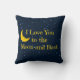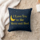 Homem Delicioso na Lua sobre fundo estrelado azul marinho com texto amarelo-lua, travesseiro decorativo "Eu te amo a lua e o fundo".