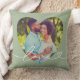 O design de travesseiro decorativo personalizado moderno e na moda apresenta uma foto favorita em uma grande forma cardíaca com um design de camada branca mínima de tipografia "Love" que inclui detalhes florescentes e cardíacos. A cor de fundo verde de louros de folha pode ser modificada. Uma ideia de presente única para um casal recém-casado ou para o seu amado no Dia de os namorados!