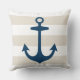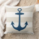 design de sotaque quadrado na moda e travesseiro com sotaque quadrado apresenta um padrão listrado de cabana branca e bege neutro com âncora azul marinho do barco. A cor de fundo bege pode ser personalizada.