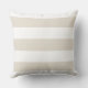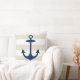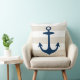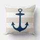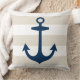 design na moda e travesseiro de sotaque quadrado chic apresentam um padrão litorâneo de extensas faixas brancas de cabana com uma âncora azul marinho de barco. A cor de fundo bege pode ser personalizada.