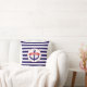 Um travesseiro que caracteriza uma ilustração de uma âncora com uma bandeira que possa ser personalizada com nome. O fundo é listras azuis.