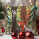 Animais fofos da floresta em uma floresta de Natal verde, apresentando um cervo, rena, duas raposas pequenas, pássaros, coruja e um texugo. As plantas têm bagas em suas folhas e há cogumelos crescendo, o chão está com neve e o sol brilha através dos galhos, árvores da floresta. Obra de arte original de Caroline Bonne Müller