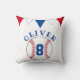 Travesseiro decorativo de Aniversário de criança de Ball Bunting Ball. O design tem bandeiras de baseball e bunting em cores vermelha, branca e azul. Adicione seu nome e sua idade.
