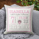 Travesseiro de anúncio de nascimento de menina com bolinhas rosa e cinza e branco adoravelmente fofo com uma coruja rosa doce. Edite para incluir todos os detalhes do nascimento do seu precioso bebê.