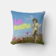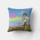 Um travesseiro decorativo divertido e inspirador mistura uma variedade de elementos: um recorte de fotos pintado de um anjo/fada sobre o fundo de céus azuis e flores com néon rosa e amarelo "respirar apenas"