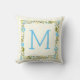 Aqua moderno, borda floral amarela e travesseiro decorativo monográfico. Mostra uma bela borda feita de flores azuis e amarelas de aqua, folhas verdes de oliveira e seu monograma.