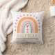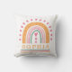 Um brilhante e alegre travesseiro decorativo personalizado para fazer uma menina se sentir especial. Tem uma modelo de texto para personalizar com o nome dela. Um arco-íris brilhante de amarelo-dourado, cor-de-rosa e lacre é cortado em corações cor-de-rosa. A parte traseira do travesseiro tem faixas horizontais largas correspondentes no mesmo esquema de cores delicioso.