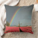 O travesseiro decorativo com um arco-íris colorido em um céu escuro sobre um moinho de vento e um cheio do campo de tulipas vermelhas brilhantes durante um primavera atacam em uma paisagem perto de Amsterdão nos Países Baixos.