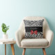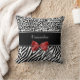 Um travesseiro animal preto e branco na moda do teste padrão com as listras modernas da zebra na parte inferior e um leopardo à moda imprimem na parte superior e embellished com uma fita vermelha feminino amarrada em um arco. Personalize este travesseiro chique da forma das mulheres adicionando seu nome. Imagem impressa do plano, fita nao real.