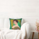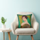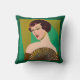 Travesseiro em um moderno, semimabstrato, Art Deco inspirou o retrato de uma moça humorística, segurando um fã, contra um pano de fundo verde-jade e dourado