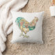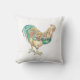 Almofada decorada com uma ilustração colorida de um galo. Um lado tem uma única impressão grande do galo, o outro lado é decorado com a mesma arte como um padrão.