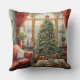 Um belo travesseiro vermelho e verde, quente e aconchegante, de uma sala de estar com uma cadeira vermelha, janela e árvore de Natal