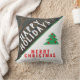 Travesseiro de Natal russo, festivo, vermelho e verde das árvores de Natal. Travesseiro de Natal divertido com feriados felizes e tipografia de Natal feliz. Cores festivas em verde, vermelho e branco, uma árvore de Natal simples, flocos de neve e fundo de madeira escura rústica.