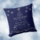 Este bonito travesseiro de feriado apresenta frases sazonais e saudações em prata que formam uma forma de árvore de Natal. As frases incluem "Deck the Halls", "Jingle Bells", "Holly Jolly Christmas", "Desejamos a você um feliz Natal" e muitas outras. Há uma estrela de prata correspondente no topo, e os flocos de neve de prata ornamentado estão espalhados. As imagens prateadas são colocadas sobre um fundo azul escuro. Ambos os lados do travesseiro têm o mesmo fundo e a mesma imagem.