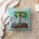 Travesseiro com uma imagem de feriado sazonal. Uma palmeira tropical decorada em luzes festivas com uma estrela no topo. Uma bengala branca e vermelha gigante que sai da areia. Presentes de Natal debaixo da árvore. Whimsical e divertido.