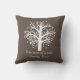O travesseiro decorativo da lembrança da família, a árvore branca com nomes & as datas, adicionam os nomes dos pais e a data do casamento no tronco da árvore. Três pássaros na árvore, com sala adicionar nomes e aniversários para até três crianças. Para trás do travesseiro tem a mesma árvore branca, e abaixo da árvore, o seguinte texto: O começo de uma árvore genealógica nova. Branco no Taupe.