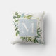 Este travesseiro é desenhado com uma armação verde ao redor de um monograma, e a parte de trás é um azul poeirento sólido.
