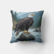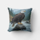 Uma águia-careca majestosa é pregada em uma rocha no meio de um rio fluente, enquadrada por um pano de fundo de montanhas nebulosas e árvores verdes densas