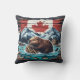 Um castor canadense constrói uma barragem em um rio sereno, cercado por montanhas e árvores verdes, com pano de fundo de bandeira canadense.