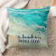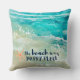 Adicione uma vibração de praia a sua casa com este acolhedor travesseiro decorativo costeiro de algodão com turquesa tropical aquática e ondas oceânicas de espuma-do-mar, estrelas-do-coral e "a praia é o meu lugar feliz" tipografia num azul-marinho náutico. Arte por KL Stock
