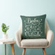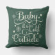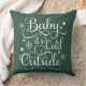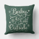 O design do travesseiro sazonal apresenta o escrevendo de script "Baby it's Cold Outside" com sotaques de estrelas e flocos de neve em ambos os lados. A cor verde de fundo do caçador escuro pode ser personalizada para coordenar com o decoro de férias.