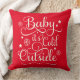 O design do travesseiro sazonal apresenta o escrevendo de script "Baby it's Cold Outside" com sotaques de estrelas e flocos de neve. A cor vermelha de fundo brilhante pode ser personalizada para coordenar com a decoração de feriado.