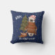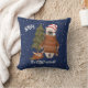 "BABY está frio lá fora" declara a frente deste travesseiro decorativo fofo. Um urso desnorteado num suéter de esqui e um Papai Noel vermelho e branco listrado que segura uma lanterna enquanto a neve cai ao seu redor. Aos seus pés está uma raposa vermelha escondido num invólucro. Um pinheiro verde está no fundo. A parte de trás do travesseiro tem a mesma imagem, mas sem o texto.