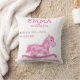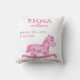 Um adorável desenho de cavalo de balanço rosa. Este travesseiro bonito dá as boas-vindas a uma menina. Um travesseiro personalizado inclui o nome do bebê, a data de nascimento, a hora de nascimento, o peso e a duração do nascimento. O reverso do travesseiro é rosa.