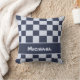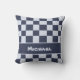 Você conhece um menino que recentemente entrou no círculo de amigos e familiares? Esta almofada para berçário de bebê apresenta um design de colcha em padrão quadrado em cores azul escuro e claro alternadas e é personalizada com o nome do menino especial. O padrão quadrado preenche a frente desta almofada junto com uma faixa correspondente para o nome do bebê. A parte de trás da almofada é azul sólido, deixando bastante espaço para texto adicional ou fotos.