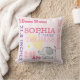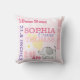 Travesseiro estatístico de recém-nascidos cor-de-rosa com espaço para o aniversário, a duração, o peso e a hora de nascimento do bebê. Design de texto colorido e divertido com elefante gingham, corações e margarida. Letra monográfica de bloqueio de bebê grande no lado oposto.