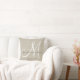Travesseiro personalizado bege, cinza e monograma branco com nomes de noiva e noiva e data de casamento em um design de sobreposição de fonte de script em um fundo de efeito fotográfico de linha bege IMPRESSO. Elke Clarke© para MonogramaGallery no Zazzle. Faz um presente excelente para recém-casados. Trendy de excelente, acessório elegante para o seu quarto, cadeira favorita, como decoração divertida em sua sala de estar ou adição decorativa formal à sua sala de estar. Personalize com seus nomes, monograma inicial e data de casamento.