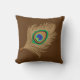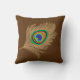 Desenho vetorial de uma pena de pavão, melhorada e reproduzida num efeito de cráton de conte mole - bege ouro mole e pena de bronzeamento, com ferrugem, azul de cobalto e olho verde esmeraldo, num travesseiro decorativo de fundo castanho de chocolate